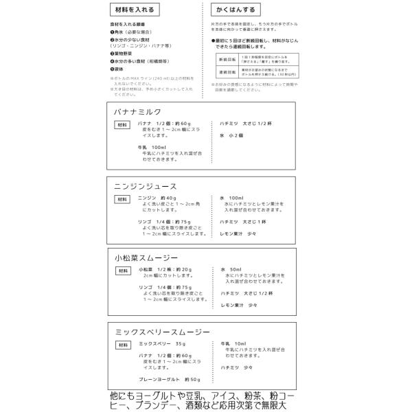この時期、栄養バランスか崩れ巣ごもりで免疫力が落ちたり太られた方もいるのではないでしょうか。最近テレビでも人気のスムージーが健在です。やはり保存料や糖質、添加物なしで健康的に摂取するには自分で作るのがお勧め。新しくスムージー用のカッターを開発。ジュースでもok 野菜や果物をそのまま食べるより効率が高く繊維を壊さず熱を出さないので繊維やビタミン、ミネラル、タンパク、乳酸、酵素なども簡単に多く吸収されやすい。材料をボトルに入れて本体にセットして上から押すだけで簡単。氷や牛乳ヨーグルト忙しい朝でもラクラク作れます。付属のフタをセットすればそのまま持ち運びできるボトルになります。