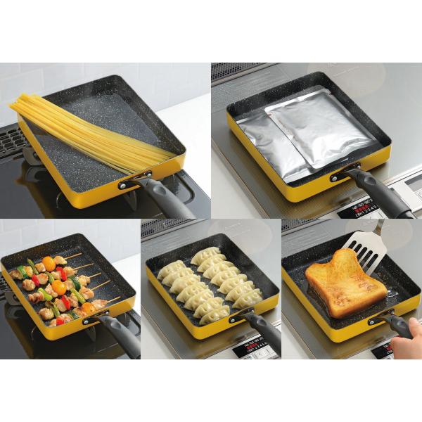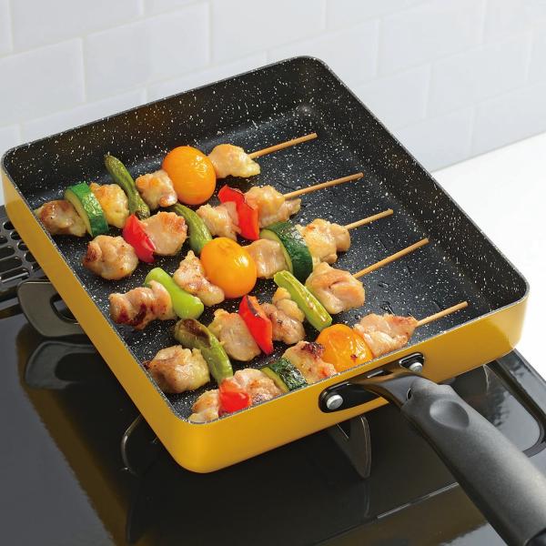 IH対応、ガスコンロ対応のコンパクトなガラス蓋つき四角いフライパン。調理面積は28cmの丸型フライパンとほぼ同じ。