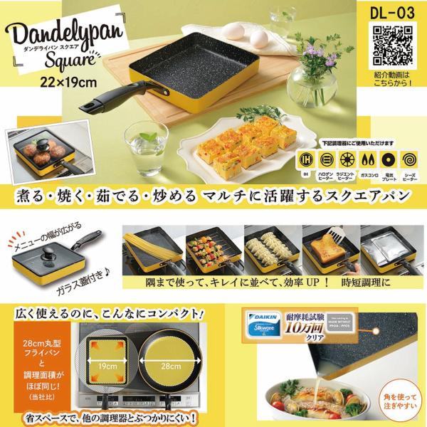 フライパンダンデライパンスクエア 四角 蓋つき ガラス蓋 フタ付き ガスコンロ対応 IH対応 22×19cm