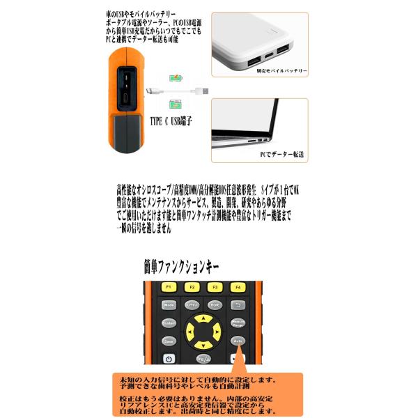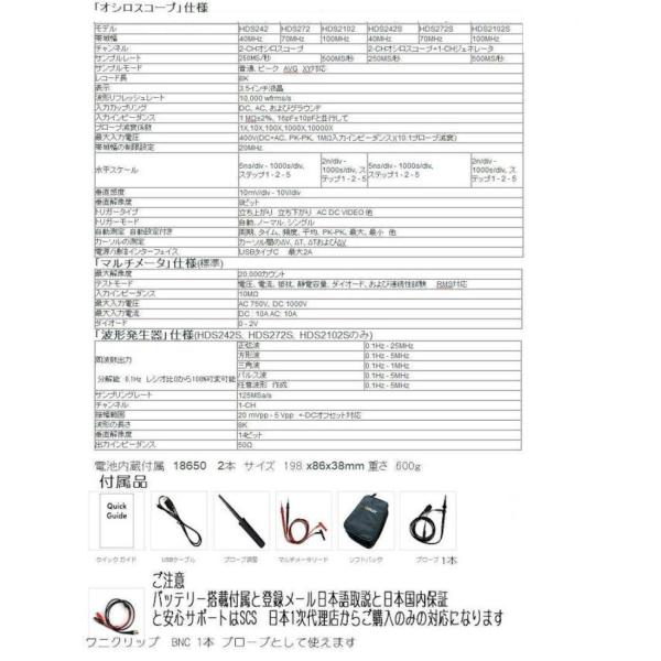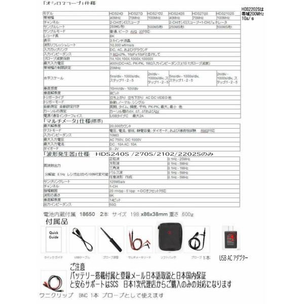 超特価セール 新製品HDS200シリーズHDS242 40MHz /HDS272 70MHz 250MSa/HDS1102 100Mz 500MSa/sサンプリングHDS242S HDS272S HDS2202 200MHz 末尾Sは任意波形発生器搭載 業界初多機能ハンドヘルド2CHオシロスコープ とDMM41/2桁 20000カウントマルチメータとDDS高精度任意波形発生器Sタイプハンディで3.5インチ大画面高視野角高解像度の多機能, 高コントラストカラーLCD搭載2チャンネル8BIT500s/sと8Kロング記録41/2桁 20000カウントマルチメータ 0.5% AC DC RMS電圧、電流、抵抗、静電容量、ダイオード導通試験DDS高精度任意波形発生器Sタイプ125MSa/s14BIT分解能 8Kの最大25MHz 0.1Hz分解能20mVから5Vpp 正弦波、方形波、パルス、スイープ任意同期可能16任意波形搭載片手で持てるハンドヘルド小型軽量で屋外使用も可能ジプロップなど防水袋で雨や雪の時もワンタッチ自動測定機能簡単機能切替市販18650リチウム電池内蔵,低消費電力3W, 約6時間動作簡単USB充電動作可能USBタイプCインターフェイス PCインタフェースと市販モバイルバッテリーやポータブル電源充電動作 サポートPCソフトウア接続 モビリテイー、修理、試験、研究開発、生産、データー収集、機器組込み OWONではありません