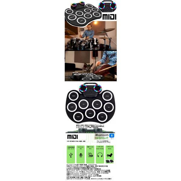 送料無料 本格ドラムをシュミレートどこでも楽々ロールアップドラムマルチセッションが楽しめますよ。ロールドラムは、巻くことによりどこでも持ち運べるどこでも音色シンセサイザードラムです。ハイアットやバスキツクペダル効果機能付きで本格的な演奏ができます。又、多様な音源変更ややサンプル曲や、リズムセッション、録音再生機能と音源や音楽やマイク入力も搭載しひとりでみんなでセッションもとっても便利です。もちろん充電池内蔵、高音質左右イルミネーションとデュアルスピーカー内蔵で野外でもOK練習時は音声出力端子付きでヘッドホンにも接続できます。更にブルトゥース音楽連携やUSB MIDIを搭載しパソコンやスマホやiphone androidタブレットやIpadなどとUSB接続しアプリで作曲、編集、収録も可能です。別にち初心者からプロまでどこでもロールアッフアップピアノやどごてもスマートギターで初心者の練習からプロまでセッションやコンサートも楽しめます。もちろん全部USB MIDI対応でアプリで作曲、編集、収録も可能です。