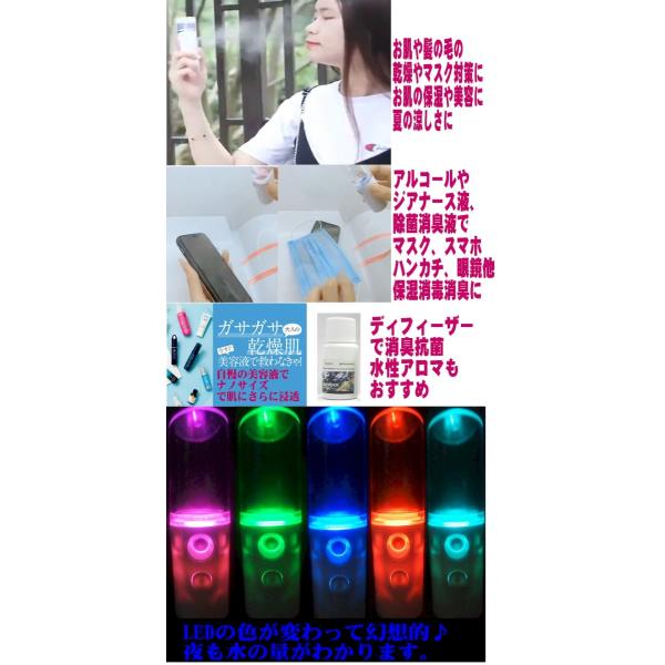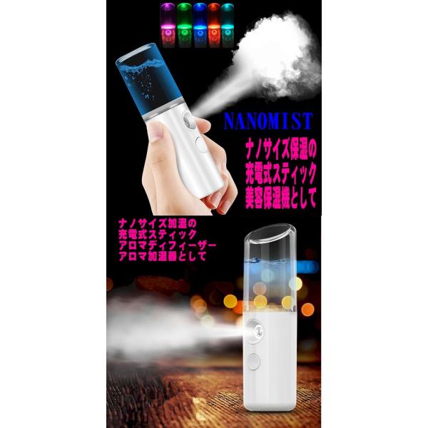 送料無料 スティック型の多用途美容除菌ナノミスト小型充電式加湿器 ナノスプレー・美容、除菌、加湿、保湿などどこでも使用できる充電式の小型軽量加湿器。・ナノミストサイズ300nmで保湿 超音波式で加熱式に比べて1/100の省電力2W、そして安全です。・美容保湿や除菌やアロマディフューザーとしても使えます。・小型軽量、ポーチやバック、車載やペットやデスクサイドでどこでも使える3way USB電源の美容、保湿加湿器です。自動で3分で停止。・7色に変化するLEDランプ搭載で夜の水の量も分かります!!・加湿で髪や肌の保湿や風邪やインフルエンザ、花粉予防、静電気防止に。・水溶性アロマオイルでアロマ芳香器としても使用できます。・美容液を入れてお肌の潤いにミスト美顔器としても。・アルコール、除菌液、薄めたジアナースアロマパウダー消臭除菌液を入れてマスクやマウスシールド、フェイスシールド、スマホ、めがね、時計のミスト除菌に<br>