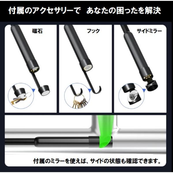 5mのチューブ先端正面のカメラは200万画素フルHD。付属の先端アクセサリーはマグネット、フック、サイドミラーの3種類。カメラの先にアクセサリーを取り付ければ、カメラで見つけたアイテムを簡単に回収できます。確認したい先が直角の場合は、ミラーで様子が確認できます。本製品は、人体にはご使用になれません。防水性能IP67。焦点距離2〜10cm。カメラ視野角70°。アプリは直感操作で簡単にビデオ録画と写真撮影が可能。(本製品を使用するためにスマートフォンやタブレットにはOTG機能が必要です)使用例:水道管の洗浄:つまりの原因や洗浄に適した道具の選定に役立ちます。パイプ内の錆、腐食、ほこり、ひび割れ検査。 造船業:ボイラー、蒸気タービン、ディーゼルエンジン、モーターも。パイプライン産業機械:エンジンのチェック電子機器、生産ライン、傷や摩耗、ギアボックス、油圧システム、自動車、空調などにも点検、検査、試験、監視、修理、緊急時に大幅に削減。対応アプリ「SUP-ANESOK」