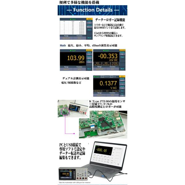高速65回/秒までの読み取り速度 オート/マニュアル 1000pointデーターロガー機能 最大最小 dB/dBm, 真のRMS AC電圧/電流測定 真の実効値DC電圧/ AC電圧、真の実効値DC電流/