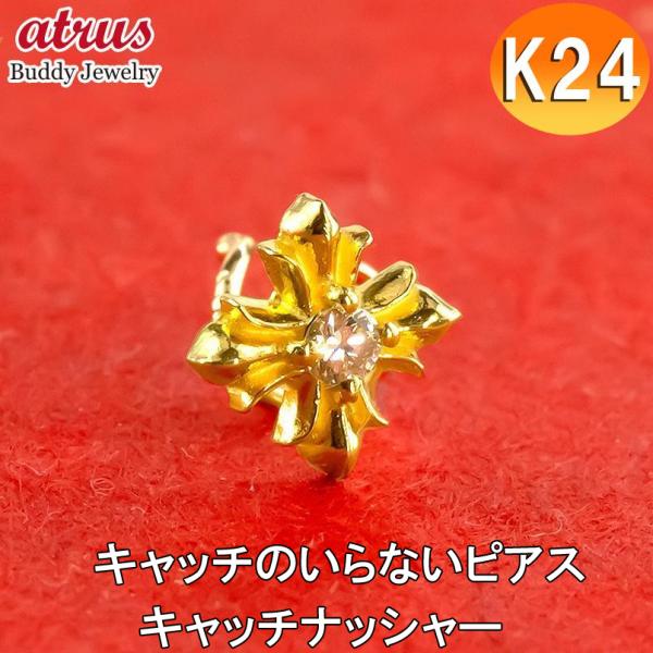 24金 ピアス 純金 クロス ダイヤモンド 一粒 片耳 メンズ キャッチのいらないピアス イエローゴールドk18 十字架 ダイヤ キャッチナッシャー あすつく 送料無料