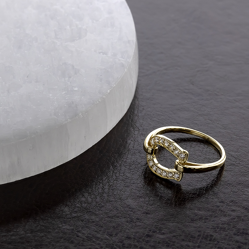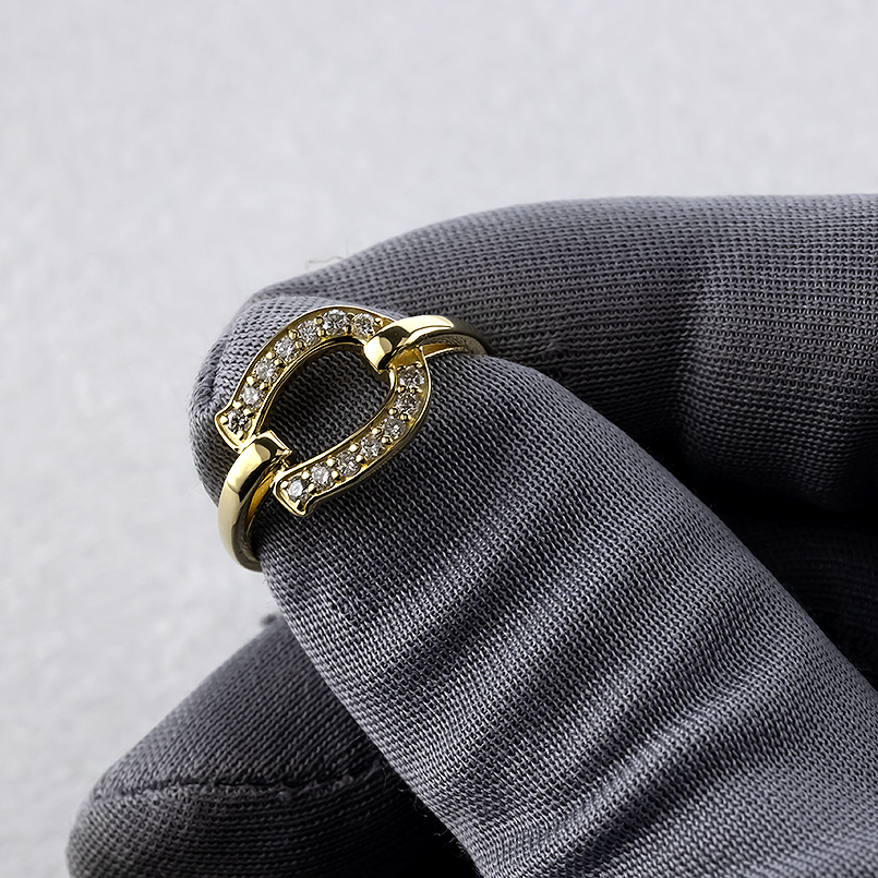 馬蹄モチーフは通常縦向きが多いですが、このリングは 横向きデザインで縦に大きくならず、指に自然に馴染むため上品でスマートな印象