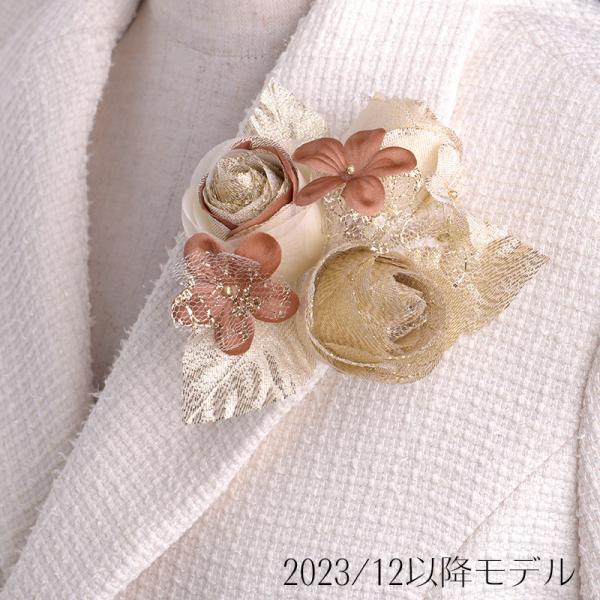 薔薇のつぼみをメインモチーフに小さな花々が取り囲み、生命感あふれる作品に仕上がっています。このバランス感はコサージュに人生をかけた職人ならではのものです。ゴールド系なのでダーク系・アイボリー系どちらのジャケットにもなじみます。