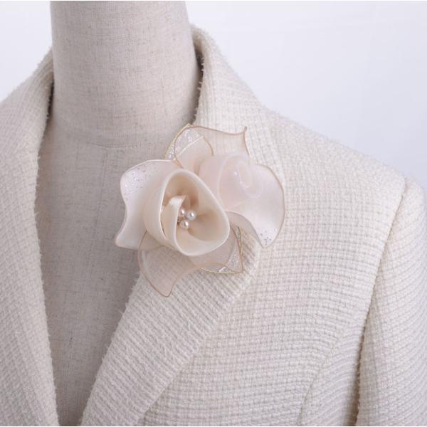 パールの花弁をシフォンとオーガンジーの質感の異なる花びらで巻き包んだ繊細なコサージュです。大き過ぎずフォーマルなスーツとのバランスも○ ラメは控えめながらオーロラが入っているので、ハレの場にふさわしい華やかさも兼ね備えています。