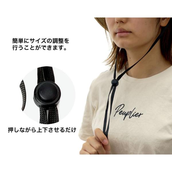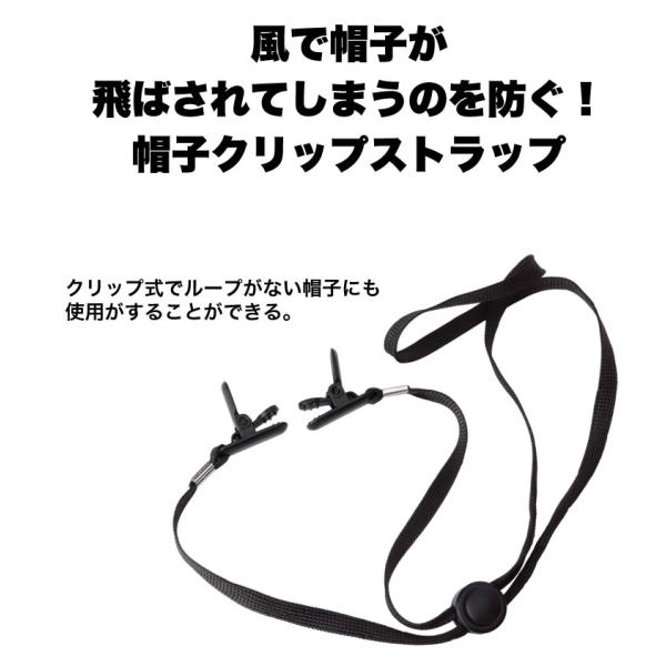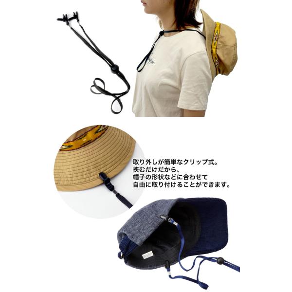 サイズ調節できるクリップ式の帽子ストラップ。