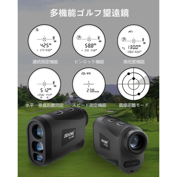 ゴルフ距離計は直線距離モード(連続測定可能)、旗竿ロックモード(最近接目標物距離を優先的に表示)、ゴルフ補償モード(上り坂/下り坂にかかわらず、実際の距離を自動的に計算)、高さ及び水平モードと速度測定モードを有する。