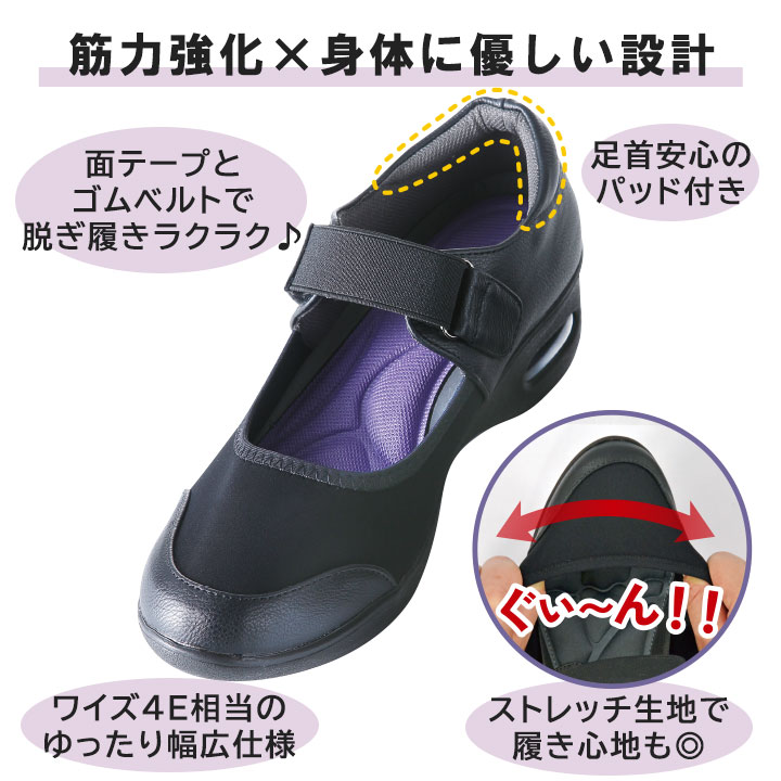 おしゃれ きれいめ 黒 疲れにくい スタイルアップ 人気 ラク 筋力強化 ゴムベルト 4E 幅広 外反母趾 履き心地がいい 楽 姿勢 美脚 疲れにくい 痛くない 4cmヒール オフィス ウォーキング