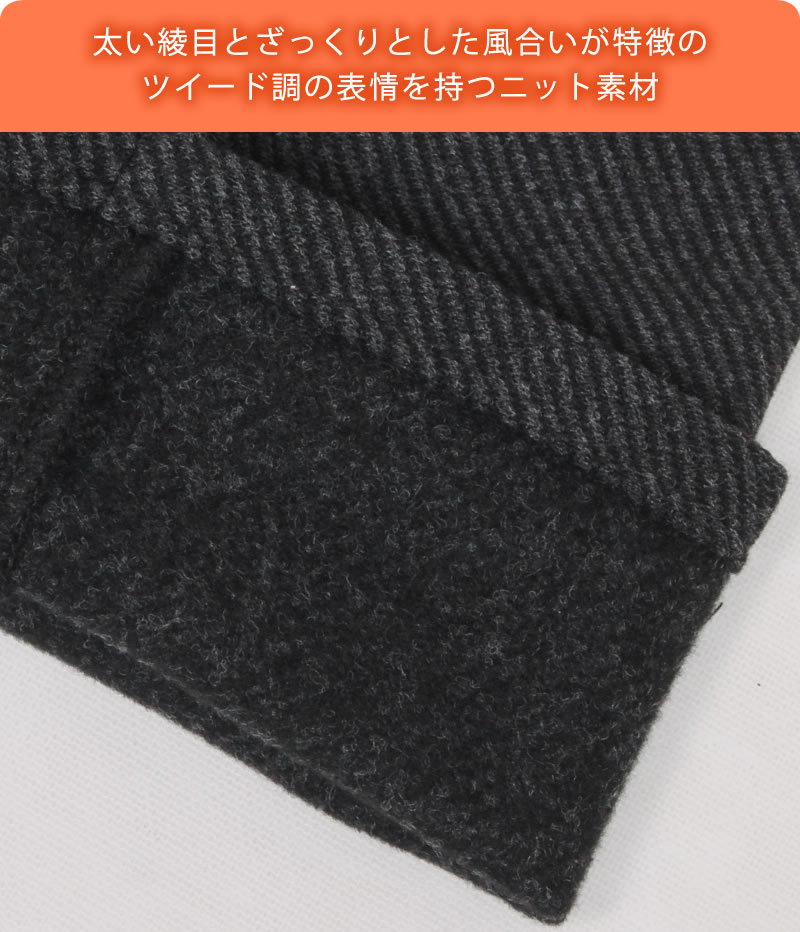 太い綾目とざっくりとした風合いが特徴の、ツイード調の表情を持つニット素材を採用。 ニードルパンチ(細かい針で刺す)加工を施すことで、独特のふくらみ感と優れた保温性を実現しました。 肉厚ながらも軽量で、長時間の着用でも快適な穿き心地を楽しめます。