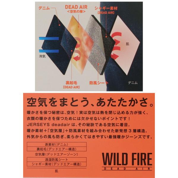 EDWIN ジャージーズ WILD FIREの新素材『DEAD AIR』は、肌側に毛足の長い起毛素材、真ん中に外気を防ぐ防風フィルム、表生地との間に空気層を作る新しい3層構造によって保温&防風性能を高めた新開発素材です。表生地にはニットを使用することで、快適なストレッチ性も兼ね備えており、真冬の寒さに最適な素材です。