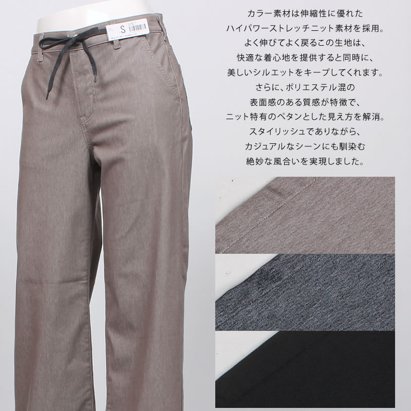 見た目はまるで本格的なデニム。でも実はニット素材。よく伸びてよく戻る生地を採用。 伸回復率に優れており、型くずれせず、くきれいに着用いただけます。 細すぎず、太すぎず、裾に向かってストンと落ちる脚長効果抜群のワイドシルエット。 ウエスト紐のイージーパンツ仕様。紐は取り外し可能。紐を取り外しても、ベルトループで紐を通す穴が隠れるようにデザインしているので、見た目の違和感なくご着用いただけます。