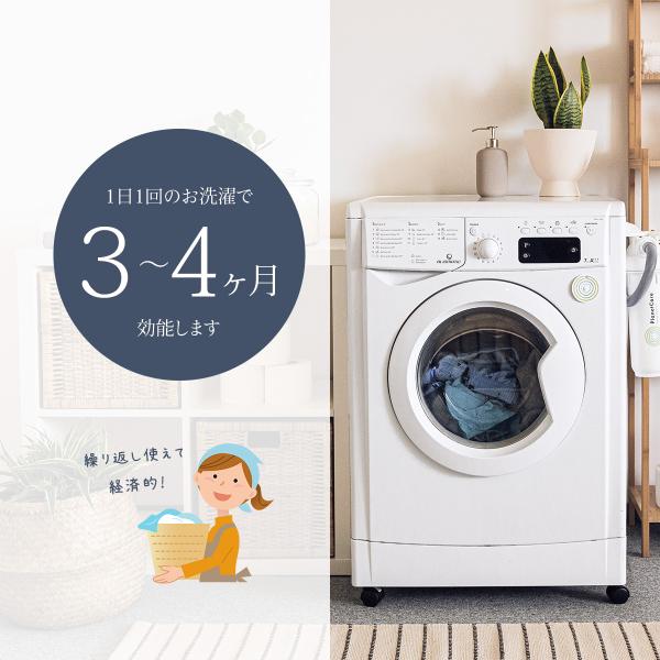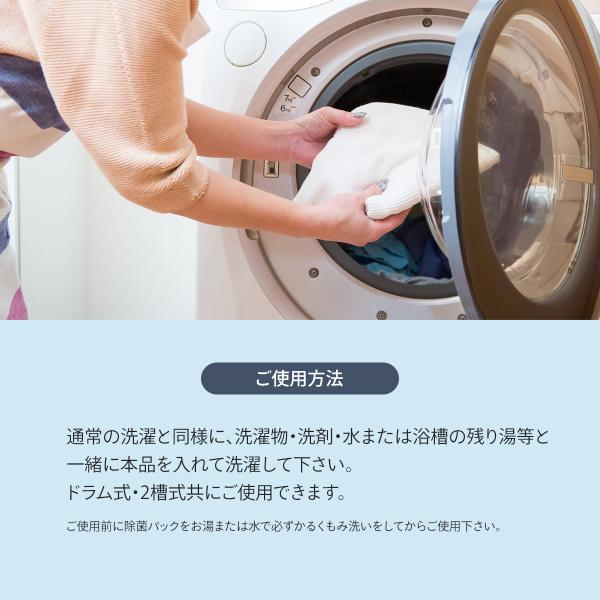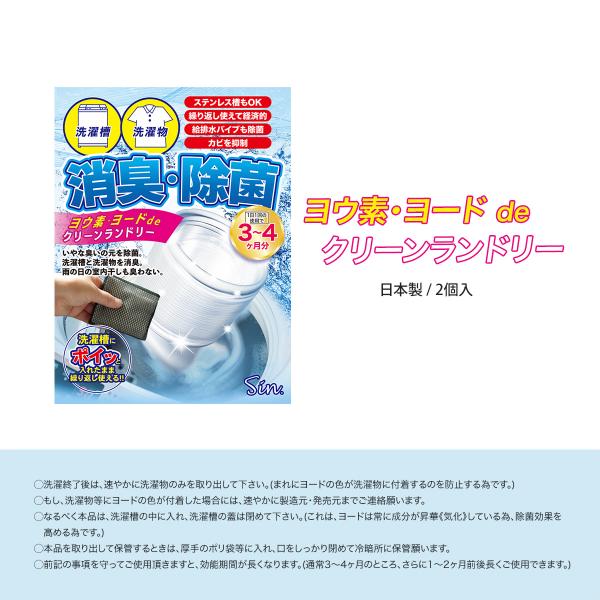 天然素材のヨウ素を使用した洗濯槽と衣類の除菌・消臭剤。 洗濯しながら洗濯槽と衣類・給排水パイプまでも除菌できます。 使用方法は簡単で洗濯時に洗濯機にポイっと入れるだけ。 漂白剤や柔軟剤も併用してお使いいただけます。気になるニオイの元やカビを抑制するから雨の日の部屋干しも気になりません。 1日1回のご使用で約3~4ヶ月効能し、繰り返し使えるから経済的です。
