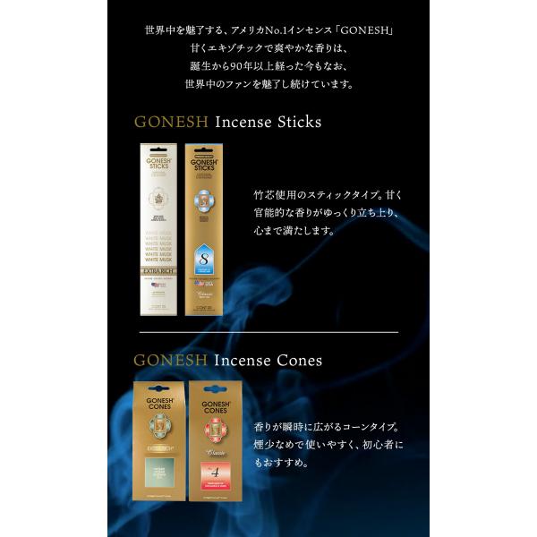 説明 竹芯を使用したお香、バンブーインセンスです。 リッチでコンプレックスなフレグランスが練りこまれたチャコールを使用しています。 じっくりゆっくり立ち上がる、強くて甘い官能的な香りをお楽しみください。 Classic クラシックは、1965年のGONESHのデビュー以来続くシリーズ。ブランドの原点。