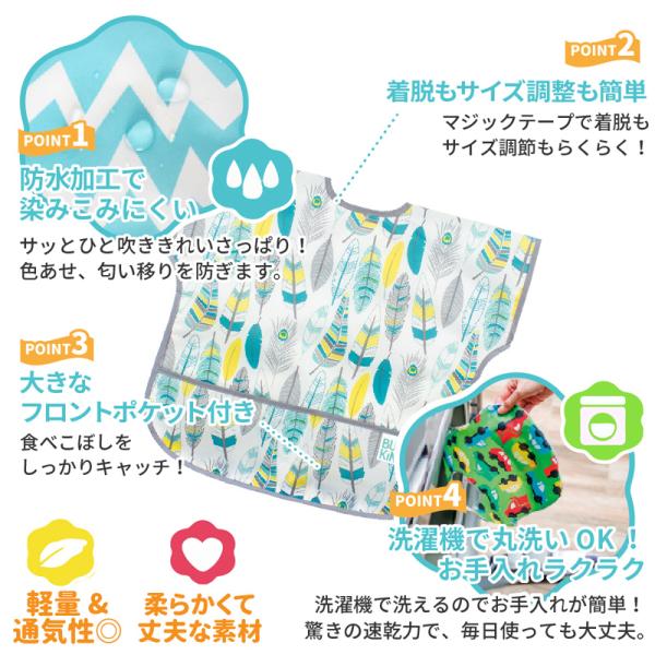 食事はもちろんのこと、お絵かきや粘土あそびなど洋服が汚れやすいシーンにも大活躍!
