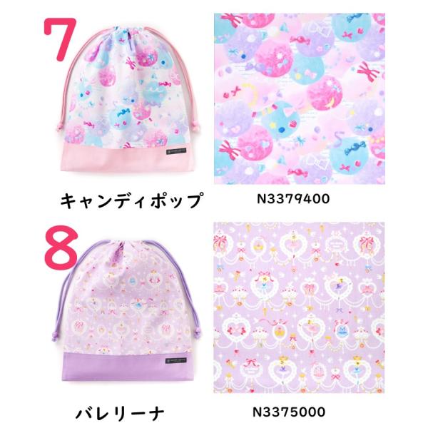カラフルな柄生地に、無地生地の底布、ひも・ループカンを同系色でコーディネートできます。
