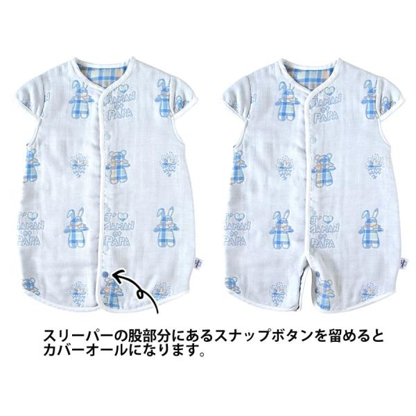 スリーパーの股部分にあるスナップボタンを留めるとカバーオールになります。
