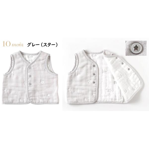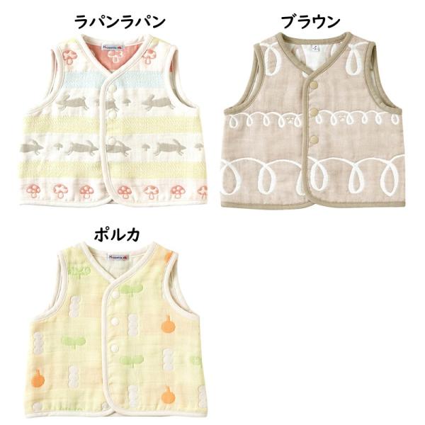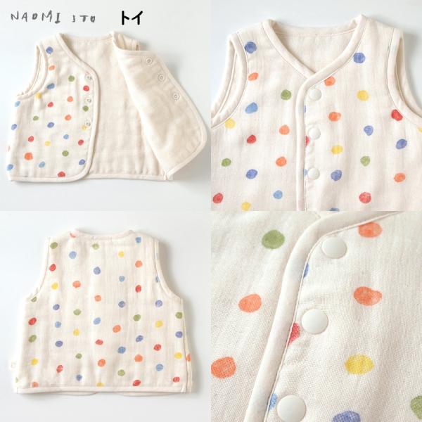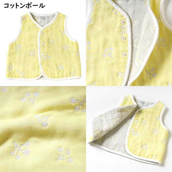 6重ガーゼのベビーベストで、柔らかで通気性と保温性を備えています。