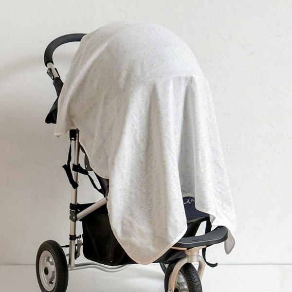 大判サイズなのでおくるみとして以外にも、ベビーカーの上に日よけとしてさっとかけたり授乳ケープの代わりにもなります。