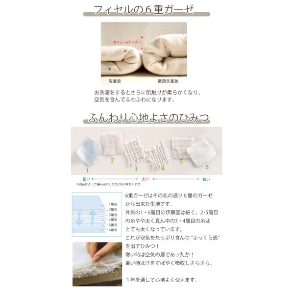 織目の違うガーゼを6層に重ねることで、ふんわり空気を含み、寒い時はあったか、暑い時は汗をすばやく吸収しさらさら。