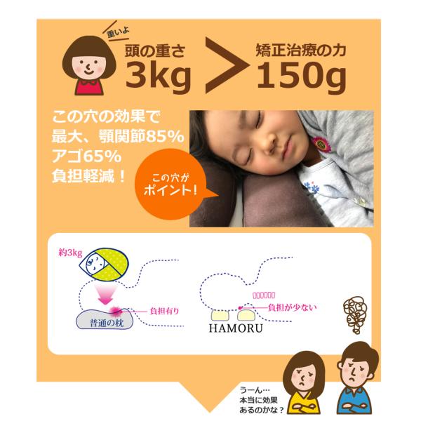矯正で用いる力が約150gに対し、枕と顔の接触圧力(頭の重さ)は、子供で約3kg・大人で約6kgです。