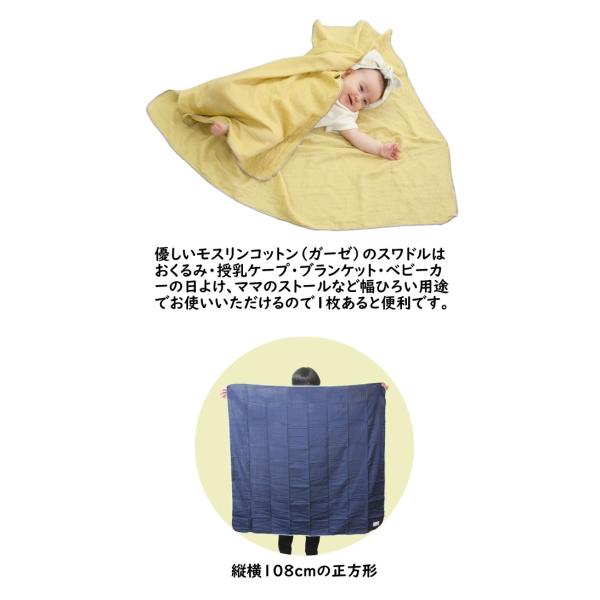 優しいモスリンコットン(ガーゼ)のスワドルは、おくるみ・授乳ケープ・ブランケット・ベビーカーの日よけ、ママのストールなど幅ひろい用途でお使いいただけるので1枚あると便利です。