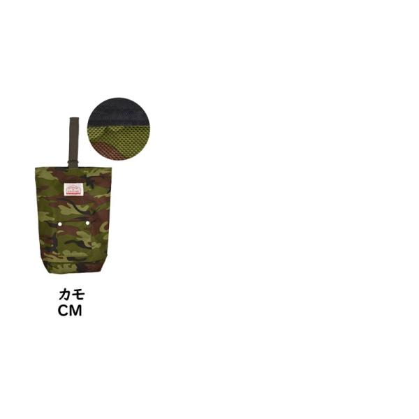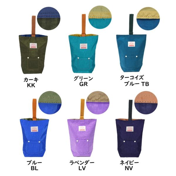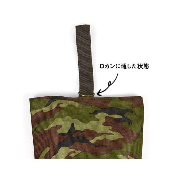 持ち手のベルトをDカンに通すだけの開閉タイプのシューズバッグ。