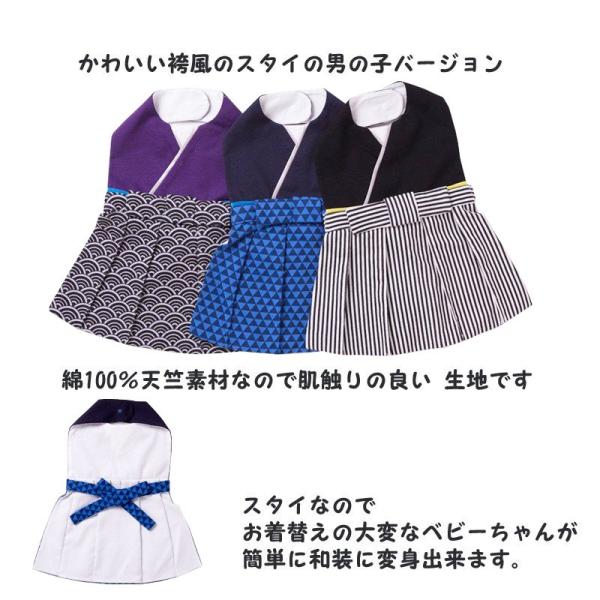特徴 かわいい袴風のスタイの男の子バージョンは袴総柄で着物が紫色・紺色・黒色の3色展開♪