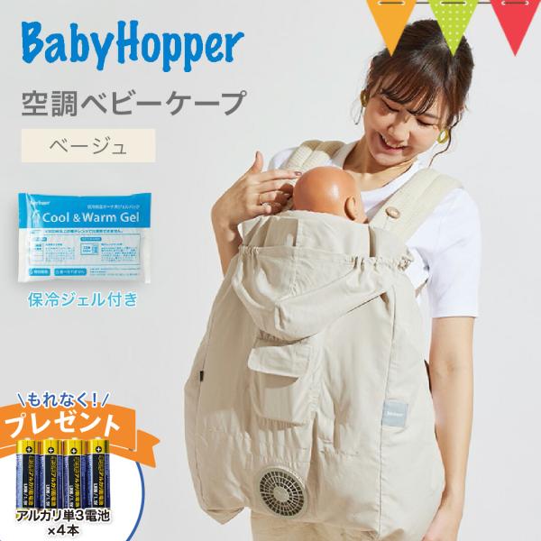 単3電池付 ベビーホッパー 空調ベビーケープ 保冷ジェル付 ベージュ|BabyHopper エルゴベビー対応 抱っこ紐ケープ ファン付きケープ 暑さ対策 UVカット