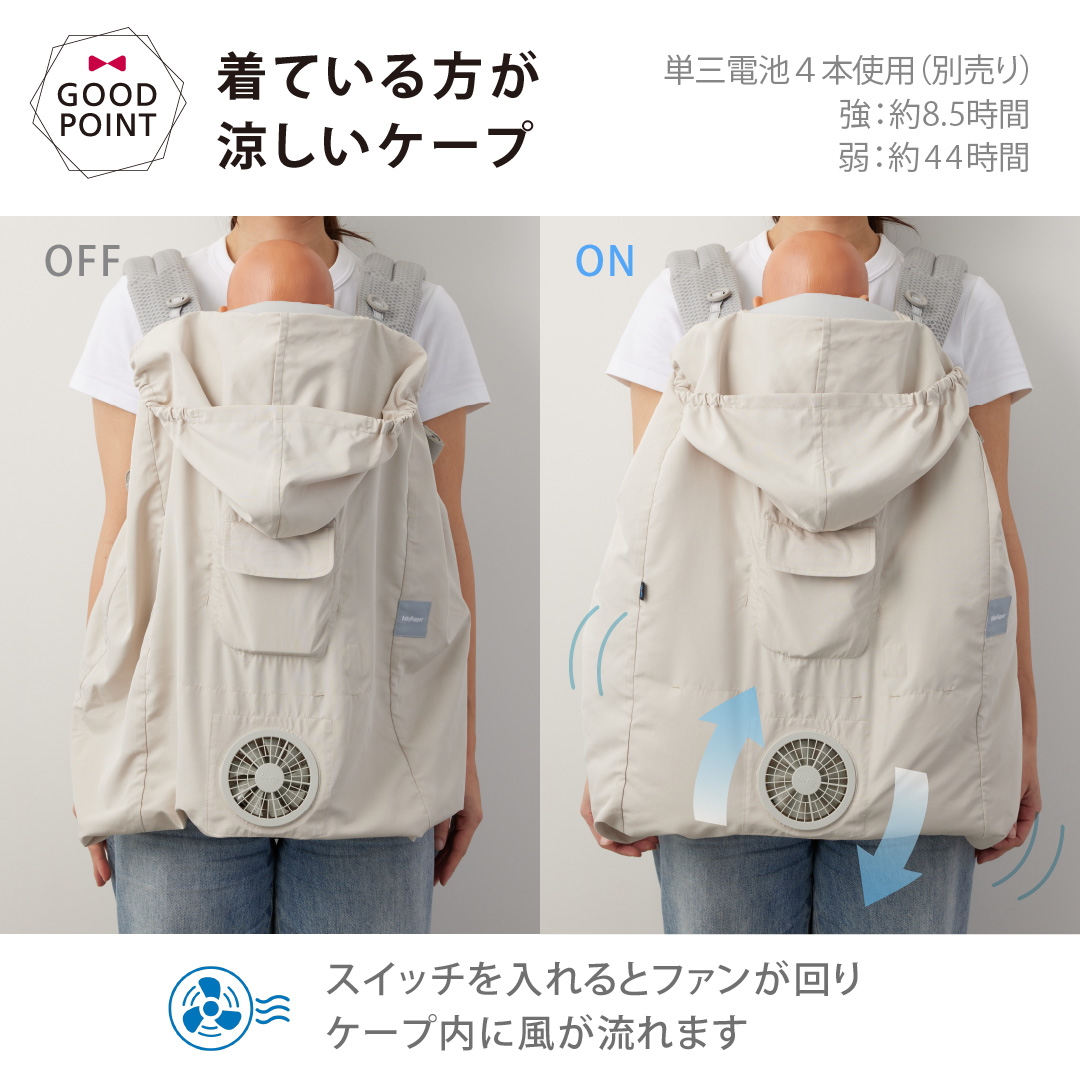 エルゴに最適、暑さ熱中書対策用、UVカットのファン付ケープ