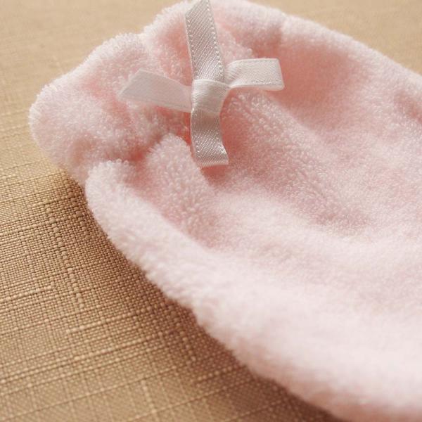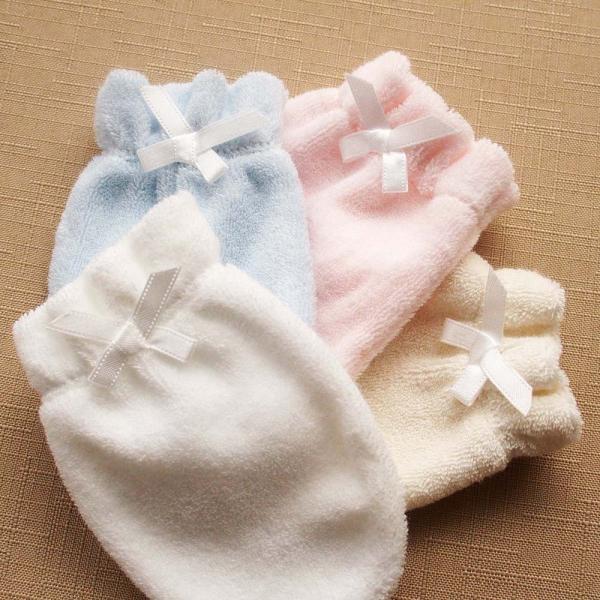 ベビーミトン 生地・縫製ともに日本製 綿85% ポリエステル15% 肌触りの良いデラックスパイルのミトンです。ねんねの時のお顔ひっかき防止に、防寒用に!ホワイト・ピンク・サックス・ベージュの4色の中からお選びいただけます♪