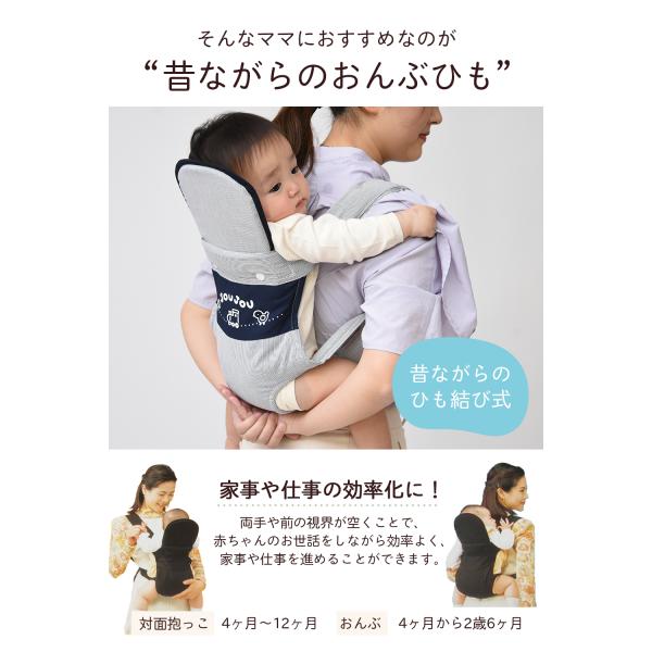 生後4ヵ月の赤ちゃんから抱っこ式なら12ヶ月(1歳 約11.3kg)、おんぶ式なら2歳6ヵ月(14.9kg)まで使用していただけます。