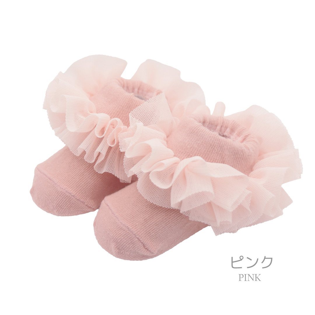 ボリュームたっぷりなチュールレースのフリルがとっても可愛いベビーソックスです。女の子のちょっとしたお出かけやオケージョンにぴったりのデザイン。ソックス裏には滑り止めがついていて安心です。大事なお子様には安心安全の日本製靴下をぜひどうぞ。