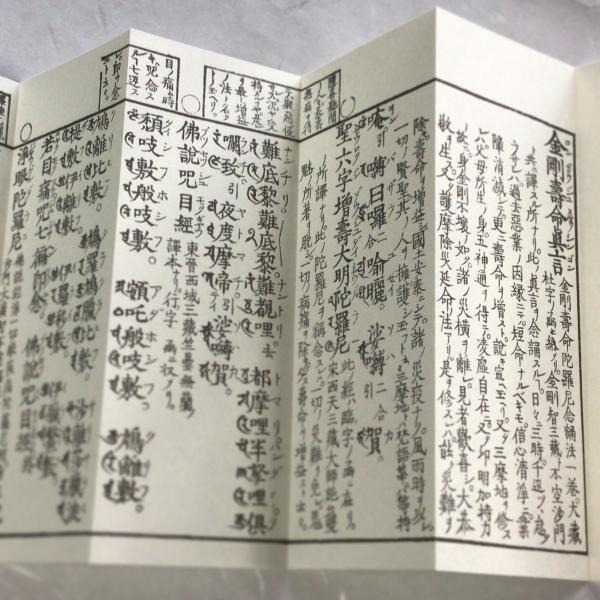 色々な御真言、お経(下記を参照お願いします)がセットになっており、携帯したり、玄関に掛けて頂けると良いとされております。