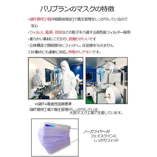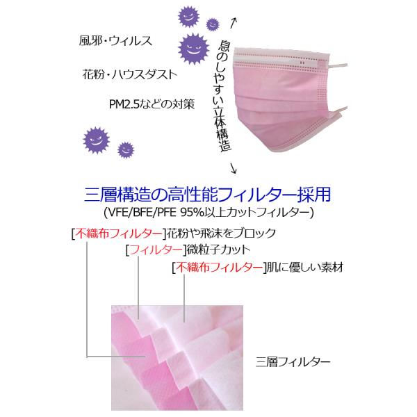 三層構造で、立体構造マスク。息がしやすいデザインになっています。VFE,BFE,PFE95%カットフィルター採用。