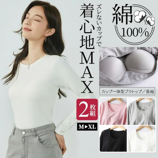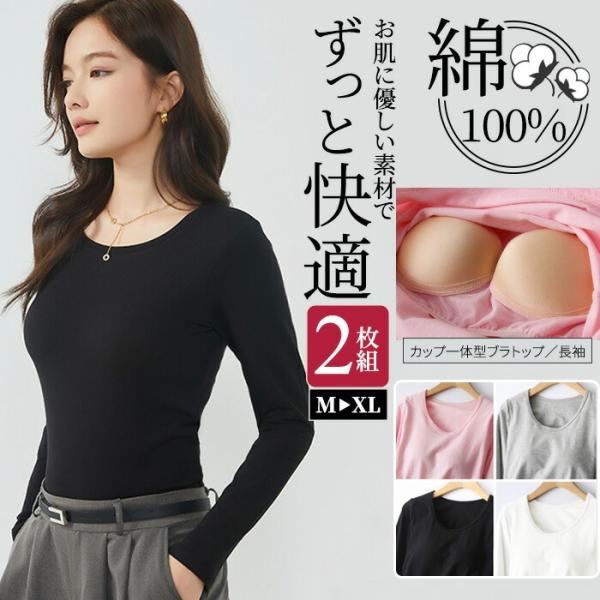 2枚組 ブラトップ 長袖 綿100% コットン カップ付き インナー \新作/ カットソー 消臭 蒸れない ノンワイヤー 春 夏 秋 冬 爆買