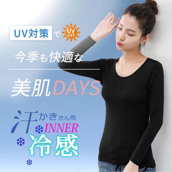 冷感 長袖 インナー ドライ 丸首 ラウンドネック レディース 汗対策 脇汗 汗染み ストレッチ 吸汗速乾 y