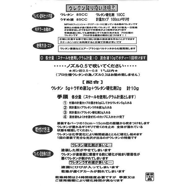 ウレタンクリア― セット 3種類 100ccメモリカップ付 ウレタン本剤・ウレタン硬化剤・ウレタンうすめ液 取り扱い説明書には 混合液の作り方・吹き付け方法・注意点・保管方法・エアーブラシの洗浄方法などわかりやすく 解説してあります。