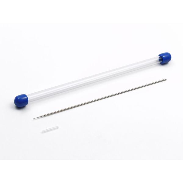 エアーブラシ作動の要となるニードル。美しい吹きつけ塗装のために、摩耗したりメンテナンス時に曲がったりしたニードルは早めに交換するのがお勧め。予備として揃えておけば安心です。ニードルの先端を保護する軟質樹脂製キャップ、ニードル本体を収納する透明樹脂製チューブとキャップがついて、保管に便利です。