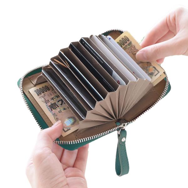 お札をカードポケット下に通して収納することで折り目が付きづらく、蛇腹式のカードポケットを採用しているので、財布を開けた時に必要なカードが一目でわかるようになっています。