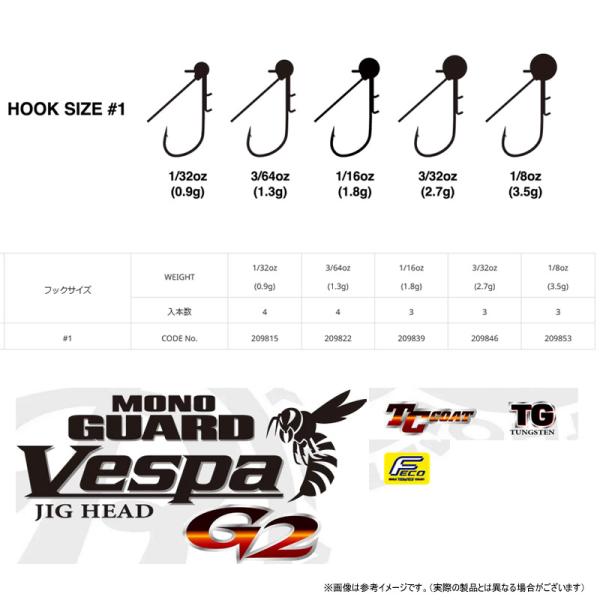 ヘッド重心は従来より前方かつ上方に設定。ミドストの際に、よりロールアクションがコントロールしやすくなった。ガードは樹脂コーティングのヨリ線ワイヤーを採用。変形→修正を繰り返してもガードが弱くなりにくい。また、ガード角度の調整によるガード力の強弱の変更がより容易になった。フックはモノガードヴェスパと同様に、ヴェスパより太軸のフックを採用。