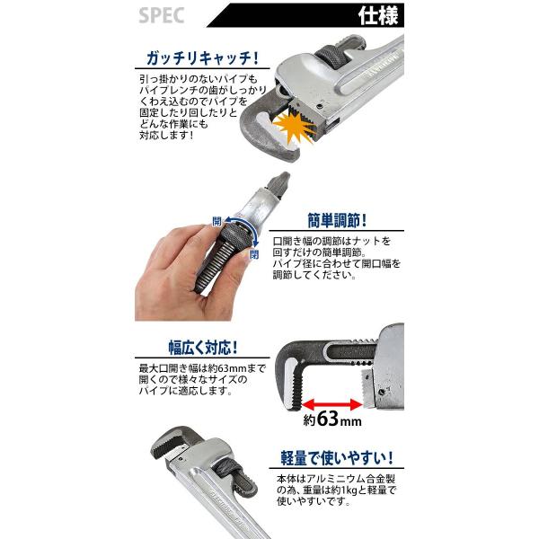 アルミパイプレンチ 14インチ 最大口開き約63mm 全長約350mm 全長最大約380mm リッヂ リッジ パイレン パイプレンチ 目盛り 14inch 鋼管 銅管 パイプ 配管 工事