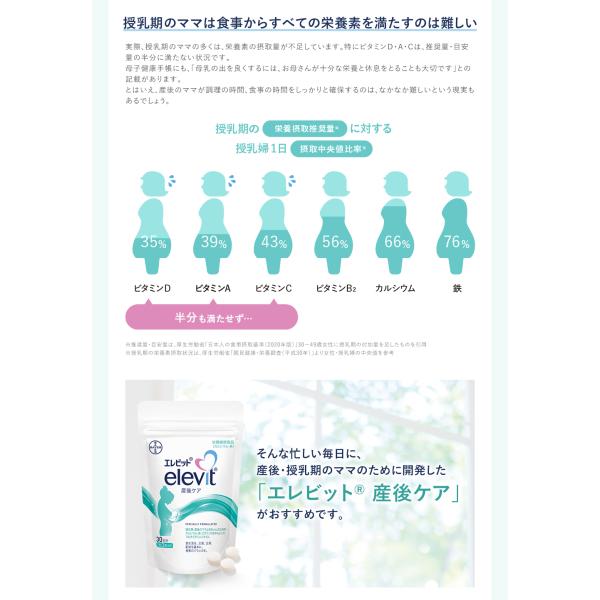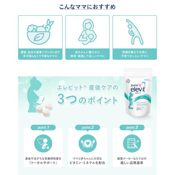 「エレビット 産後ケア」は、忙しい産後のママが自身の健康と赤ちゃんの健やかな発育に欠かせない大切な栄養を手軽に安心して摂れるように開発された、産後・授乳期用のマルチビタミンサプリメントです。