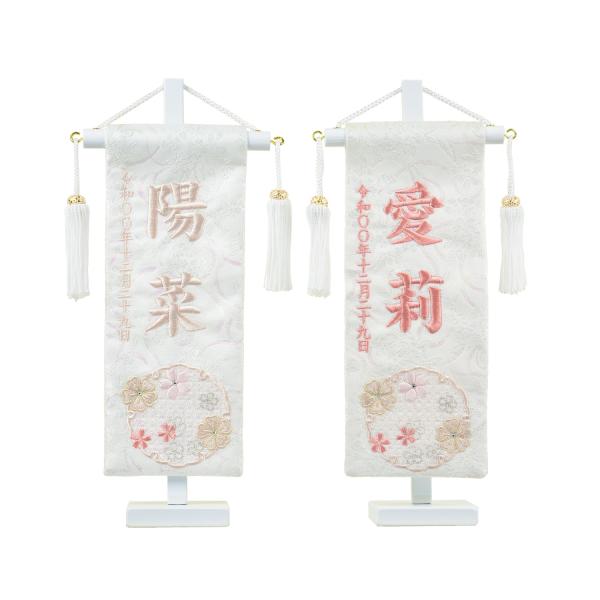 白揃え御名前旗 刺繍 白台付きセット 特小 旗サイズ23cm 雪花 国産織物使用 日本製 刺〓 ひな祭り 雛人形 女の子