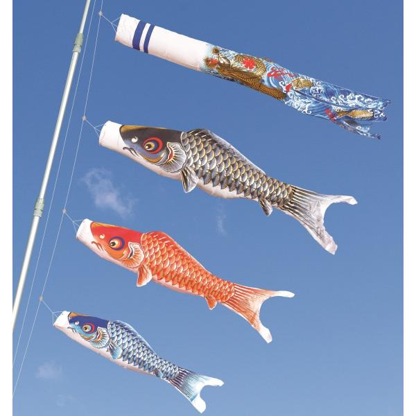 1.5mセット内容(ポールスタンド組上時高さ3.4m):吹流1.5m、黒鯉1.5m、赤鯉1.2m、青鯉1m、ポール2.3m、矢車、スタンド(ベース寸法60cm×35cm)、水タンク10L×2、掲揚ロープ