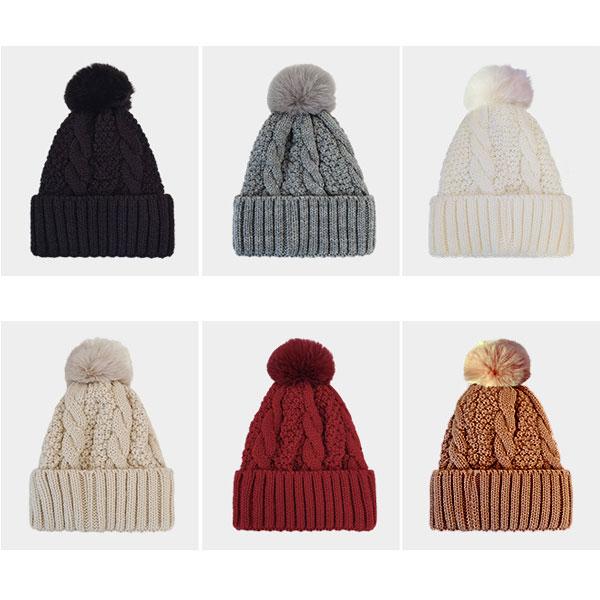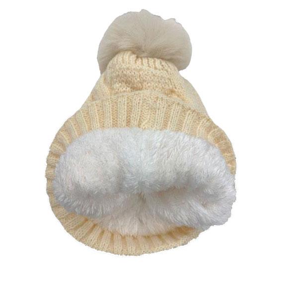 同色ポンポン、ボア裏地付きの厚手ケーブルニットキャップ。