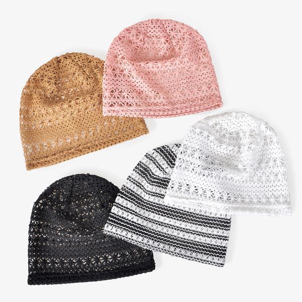◆パステルカラーとモノトーンカラーのレースキャップ◆粗めの編み状で透け感があるので通気性に優れ、熱がこもりません◆やや大きめな作りで締め付け感が無くルーズ目シルエットとなります。◆普段使い、ルームキャップ、ケアキャップと使えます