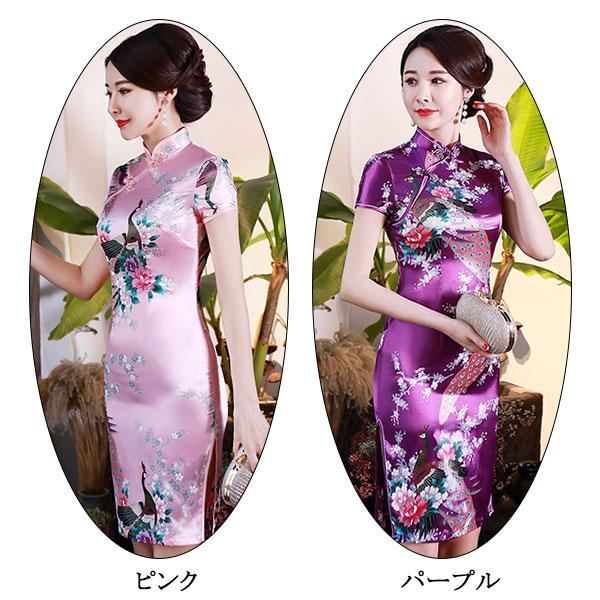 クジャク柄 チャイナドレス サテン混 ひざ丈 パーティードレス ミドル丈 チャイナ ドレス 孔雀柄 刺繍 半袖 コスプレ 衣装 セクシー China Dress 1013